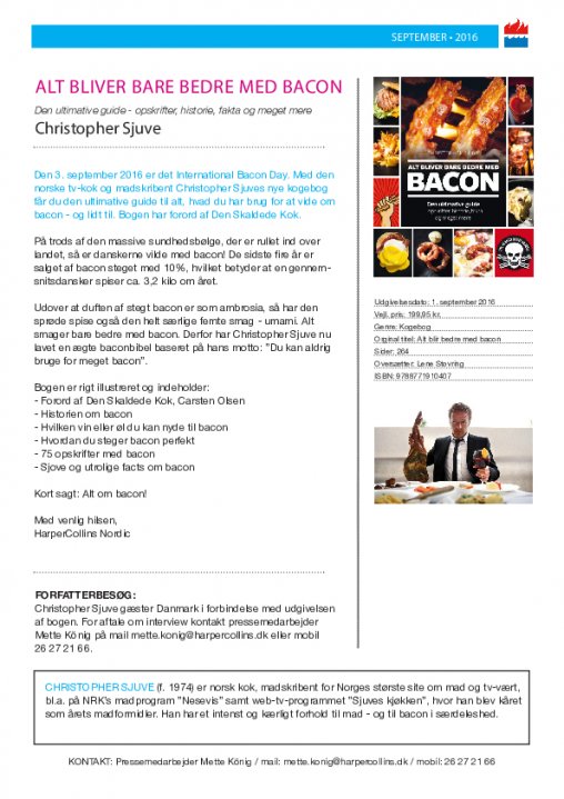 Den 3. september 2016 er det International Bacon Day. Med den norske tv-kok og madskribent Christopher Sjuves nye kogebog får du den ultimative guide til alt, hvad du har brug for at vide om bacon - og lidt til. Bogen har forord af Den Skaldede Kok.