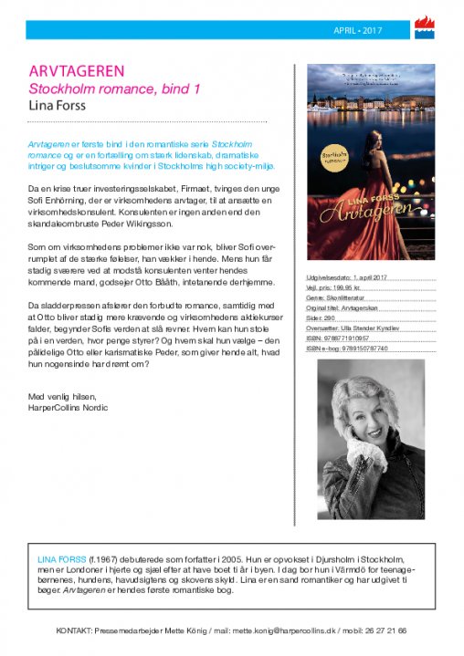 Lina Forss (f.1967) debuterede som forfatter i 2005. Hun er opvokset i Djursholm i Stockholm, men er Londoner i hjerte og sjæl efter at have boet ti år i byen. I dag bor hun i Värmdö for teenagebørnenes, hundens, havudsigtens og skovens skyld. Lina er en sand romantiker og har udgivet ti bøger. Arvtageren er hendes første romantiske bog.