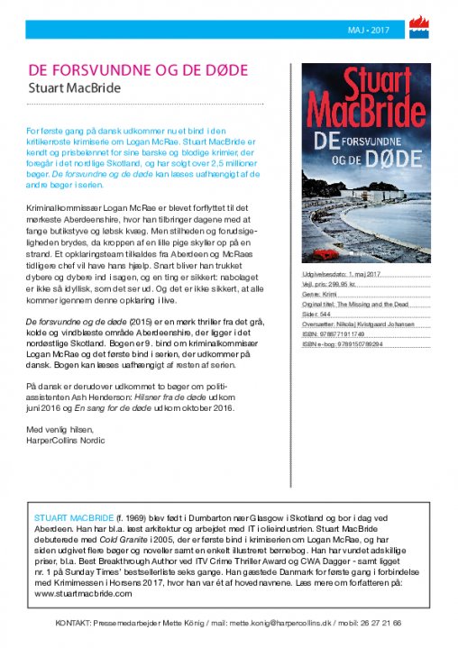 For første gang på dansk udkommer nu et bind i den kritikerroste krimiserie om Logan McRae. Stuart MacBride er kendt og prisbelønnet for sine barske og blodige krimier, der foregår i det nordlige Skotland, og har solgt over 2,5 millioner bøger. De forsvundne og de døde kan læses uafhængigt af de andre bøger i serien.