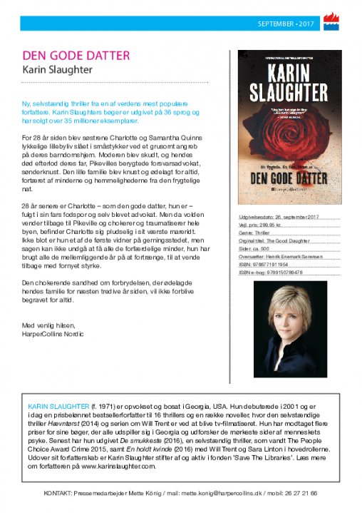 Ny, selvstændig thriller fra en af verdens mest populære forfattere. Karin Slaughters bøger er udgivet på 36 sprog og har solgt over 35 millioner eksemplarer.