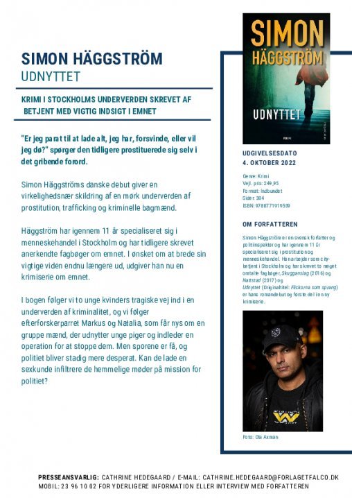 Simon Häggström er en svensk forfatter og politiinspektør og har igennem 11 år specialiseret sig i prostitution og menneskehandel. Han arbejder som city-betjent i Stockholm og har skrevet to meget omtalte fagbøger, Skugganslag (2016) og Nattstad (2017) og Udnyttet (Originaltitel: Flickorna som sprang) er hans romandebut og første del i en ny krimiserie.