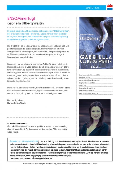 Svenske Garbriella Ullberg Westin debuterer med ”ENSOMmerfugl”, der er solgt til udgivelse i fire lande. Bogen forener krimi og erotik i en mystisk mordgåde, der handler om et spind af mørke løgne og farlige hemmeligheder, identitet og ensomhed.