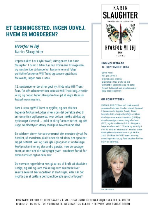 12. september er der atter godt nyt til danske Will Trent-fans, for dér udkommer den seneste Will Trent-bog, Hvorfor vi løj. Bogen byder Slaughter-fans på et ægte klassisk locked room mystery.