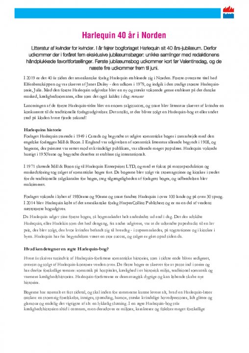 I 2019 er det 40 år siden det amerikanske forlag Harlequin etablerede sig i Norden. Første oversatte titel hed Elfenbenskäppen og var skrevet af Janet Dailey - den udkom i 1979, og indgik i den stadigt største Harlequin-serie, Julia. Med den første Harlequin udgivelse blev en ny og stærkt voksende genre etableret på det danske marked, kærlighedsromaner, eller som det også kaldes i dag: romance