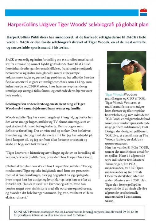 HarperCollins Publishers har annonceret, at de har købt rettighederne til BACK i hele verden. BACK er den første selvbiografi skrevet af Tiger Woods, en af de mest omtalte og succesfulde sportsmænd i historien.