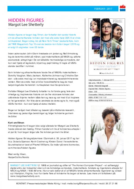 Hidden figures er bogen bag filmen, der fortæller den sande historie om de afroamerikanske kvinder, der mod alle odds hjalp USA til at vinde rumkapløbet. Bogen strøg ind på New York Times’ bestsellerliste, kom på TIME Magazine’s Top 10 over de bedste non-fiction bøger i 2016 og er solgt til udgivelse i over 20 lande.
