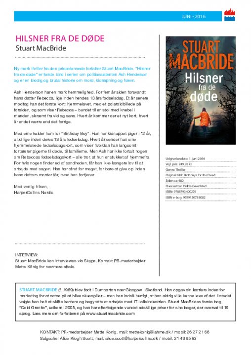Ny mørk thriller fra den prisbelønnede forfatter Stuart MacBride. ”Hilsner fra de døde” er første bind i serien om politiassistenten Ash Henderson og er en blodig og brutal historie om mord, kidnapning og hævn.