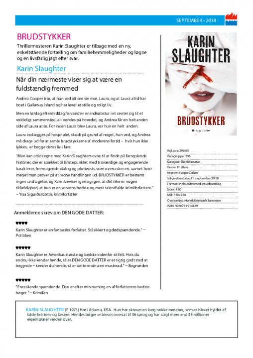"Man kan altid regne med Karin Slaughters evne til at finde på fængslende historier, der er spækket til bristepunktet med troværdige og engagerende karakterer, fremragende dialog og plottwists, som overrasker en, uanset hvor meget man prøver på at regne handlingen ud. BRUDSTYKKER er bestemt ingen undtagelse, og Karin beviser igen og igen, at det ikke er nogen tilfældighed, at hun er en verdens bedste og mest talentfulde krimiforfattere.”