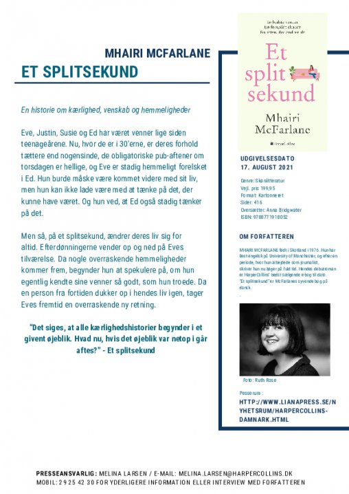 MHAIRI MCFARLANE født i Skotland i 1976. Hun har læst engelsk på University of Manchester, og efter en periode, hvor hun arbejdede som journalist, skriver hun nu bøger på fuld tid. Hendes debut roman er HarperCollins' bedst sælgende e-bog til dato. "Et splitsekund" er McFarlanes syvende bog på dansk.