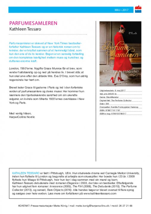 Parfumesamleren er skrevet af New York Times bestsellerforfatter Kathleen Tessaro og er en historisk roman om to kvinder, der er knyttet sammen af et hemmeligt bånd, som kun den ene af de to kender. Bogen er en sanselig fortælling om den komplekse kærlighed mellem muse og kunstner, og duftenes enorme kraft.
