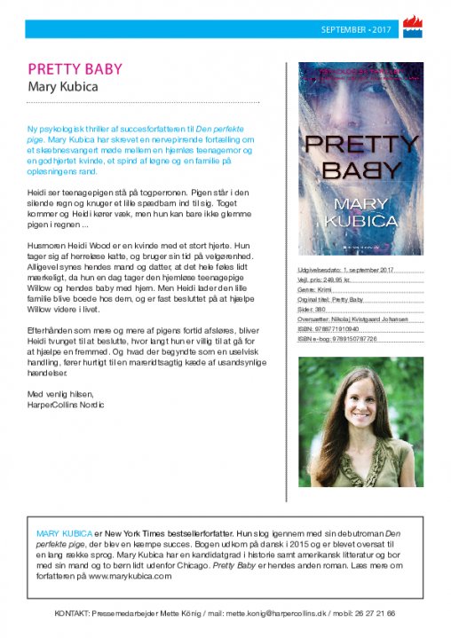Mary Kubica har en kandidatgrad i historie samt amerikansk litteratur og bor med sin mand og to børn lidt udenfor Chicago. Pretty Baby er hendes anden roman. Læs mere om forfatteren på www.marykubica.com