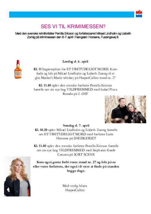 Kl. 11 bogreception for ET UBETYDELIGT MORD. Kom forbi og hils på Mikael Lindholm og Lisbeth Zornig til et glas Marker's Marks whiskey på HarperCollins stand nr. 27