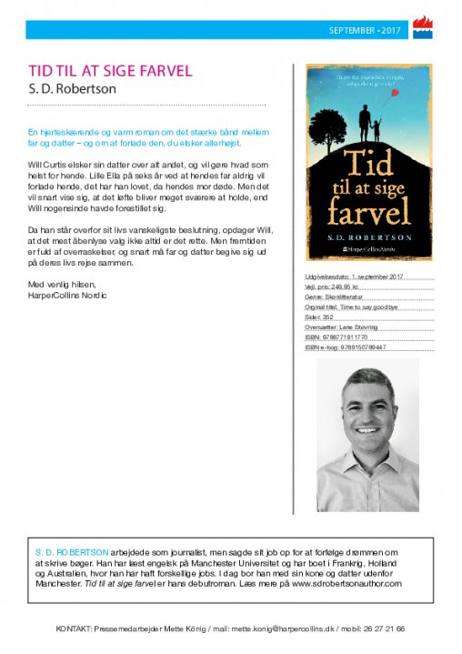 S. D. Robertson arbejdede som journalist, men sagde sit job op for at forfølge drømmen om at skrive bøger. Han har læst engelsk på Manchester Universitet og har boet i Frankrig, Holland og Australien, hvor han har haft forskellige jobs. I dag bor han med sin kone og datter udenfor Manchester. Tid til at sige farvel er hans debutroman. Læs mere på www.sdrobertsonauthor.com