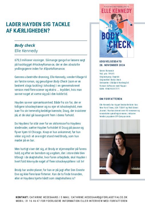 Hockey-romancens ubestridte dronning, Elle Kennedy, vender tilbage til sin første roman, og genudgiver Body Check (som er en bestemt slags tackling i ishockey) i en gennemskrevet version med flere scener og ekstra ... krydderi, hvis man