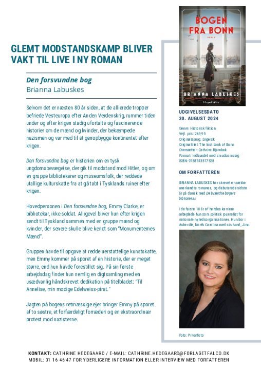 Den forsvundne bog af Brianna Labuskes er historien om en tysk ungdomsbevægelse, der gik til modstand mod Hitler, og om en gruppe bibliotekarer og museumsfolk, der reddede utallige kulturskatte fra at gå tabt i Tysklands ruiner efter krigen.