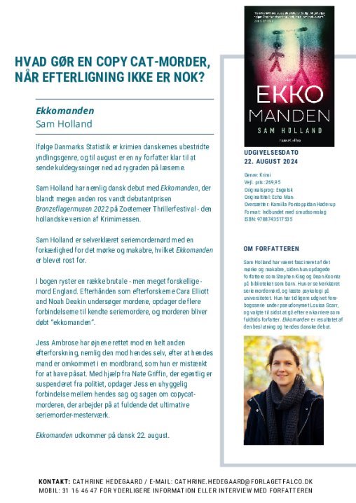 Sam Holland har nemlig dansk debut med Ekkomanden, der blandt megen anden ros vandt debutantprisen Bronzeflagermusen 2022 på Zoetemeer Thrillerfestival - den hollandske version af Krimimessen.