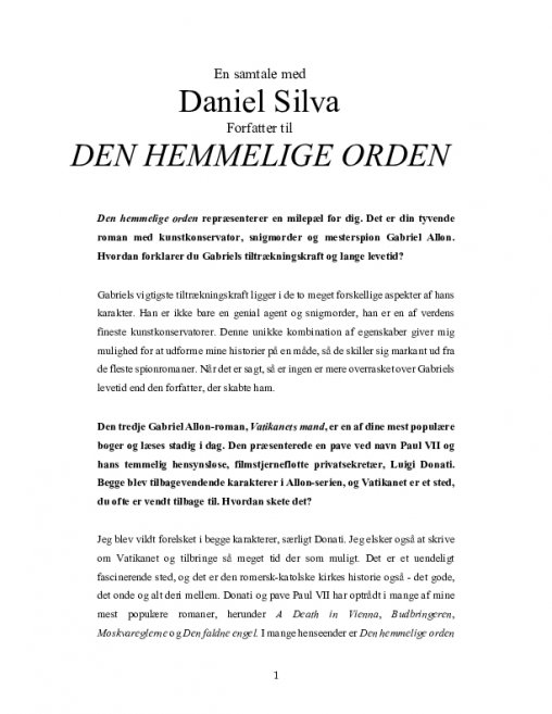 DANIEL SILVA forlod sit job som journalist på CNN for leve af sit forfatterskab. Siden da har Daniel Silvas bøger ligget nummer et på New York Times bestsellerliste og mange andre internationale bestsellerlister. Hans bøger er oversat til mere end 30 sprog og udkommer i hele verden. Daniel Silva bor i Washington D.C