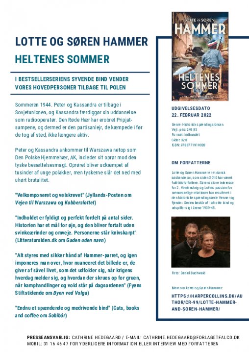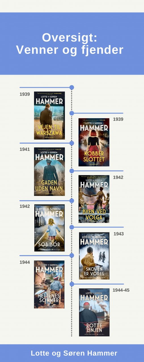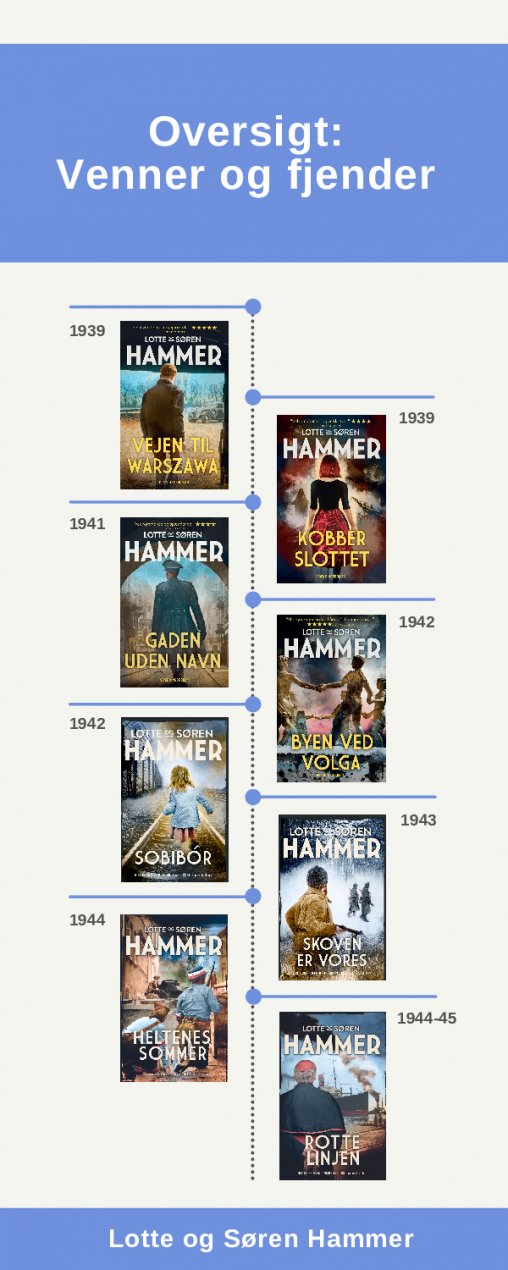 Den historiske spændingsserie Venner og fjender tog sin begyndelse i marts 2020 med udgivelsen af de to første bind: Vejen til Warszawa og Kobberslottet. Nu afsluttes rejsen blot to år senere med seriens to sidste bind: Heltenes sommer og Rottelinjen. Det betyder, at Lotte og Søren Hammer udgiver 8 bøger på 2 år – og de har fået en masse anmelderros med på vejen: