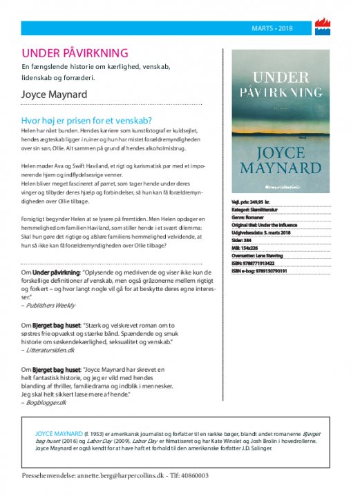 JOYCE MAYNARD (f. 1953) er amerikansk journalist og forfatter til en række bøger, blandt andet romanerne Bjerget bag huset (2016) og Labor Day (2009). Labor Day er filmatiseret og har Kate Winslet og Josh Brolin i hovedrollerne. Joyce Maynard er også kendt for at have haft et forhold til den amerikanske forfatter J.D. Salinger.