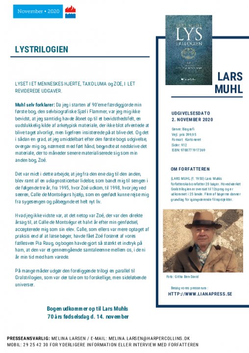 LARS MUHL (f. 1950) Lars Muhls forfatterskab omfatter 20 bøger. Hovedværket Gralstrilogien er oversat til 12 sprog og er udkommet i 25 lande. Flere af bøgerne danner grundlag for igangværende filmprojekter.