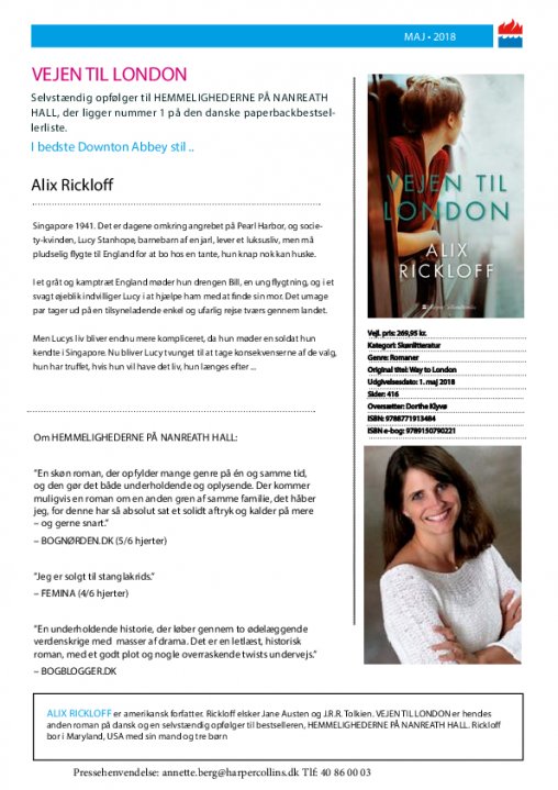 Alix Rickloff er er amerikansk forfatter. Rickloff elsker Jane Austen og J.R.R. Tolkien. VEJEN TIL LONDON er hendes anden roman på dansk og en selvstændig opfølger til bestselleren, HEMMELIGHEDERNE PÅ NANREATH HALL. Rickloff bor i Maryland med sin mand og tre børn