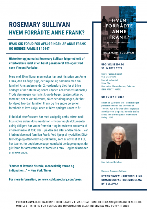 HVEM FORRÅDTE ANNE FRANK? SPØRGSMÅLET ER BLEVET REJST AF MILLIONER AF ANNE FRANK-LÆSERE, OG SØGES NU BESVARET EFTER 77 ÅR. DEN 31. MARTS 2022 UDKOMMER BOGEN OM MYSTERIET PÅ DANSK.