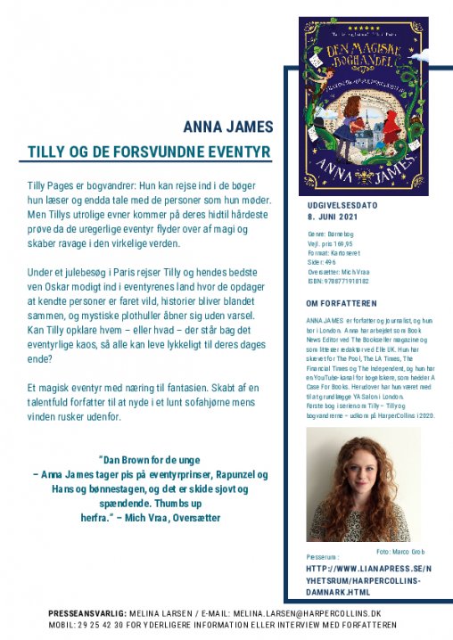 ANNA JAMES forfatter og journalist, og hun bor i London. Anna har arbejdet som Book News Editor ved The Bookseller magazine og som litterær redaktør ved Elle UK. Hun har skrevet for The Pool, The LA Times, The Financial Times og The Independent, og hun har en YouTube-kanal for bogelskere, som hedder A Case For Books. Herudover har hun været med til at grundlægge YA Salon i London. Første bog i serien om Tilly – Tilly og bogvandrerne – udkom på HarperCollins i 2020.