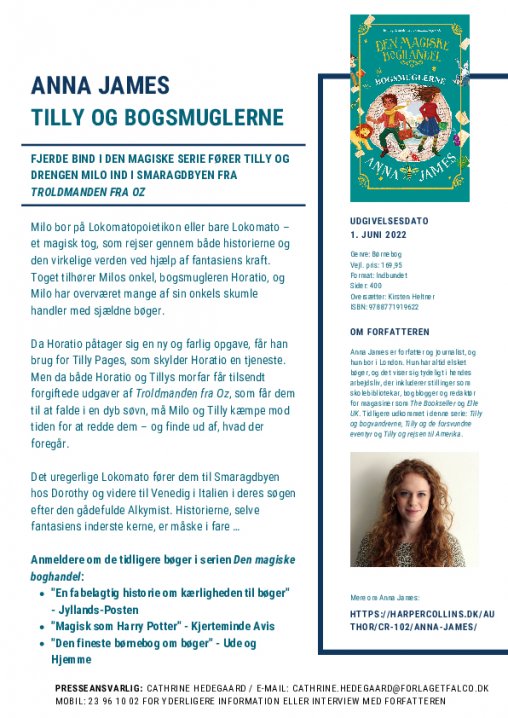 Anna James er forfatter og journalist, og hun bor i London. Hun har altid elsket bøger, og det viser sig tydeligt i hendes arbejdsliv, der inkluderer stillinger som skolebibliotekar, bogblogger og redaktør for magasiner som The Bookseller og Elle UK. Tidligere udkommet i denne serie: Tilly og bogvandrerne, Tilly og de forsvundne eventyr og Tilly og rejsen til Amerika.