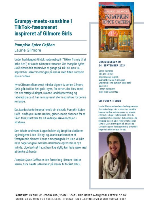 Den 24. september udkommer Laurie Gilmores Pumpkin Spice Caféen i oversættelse af Laura Kjær Larsen.